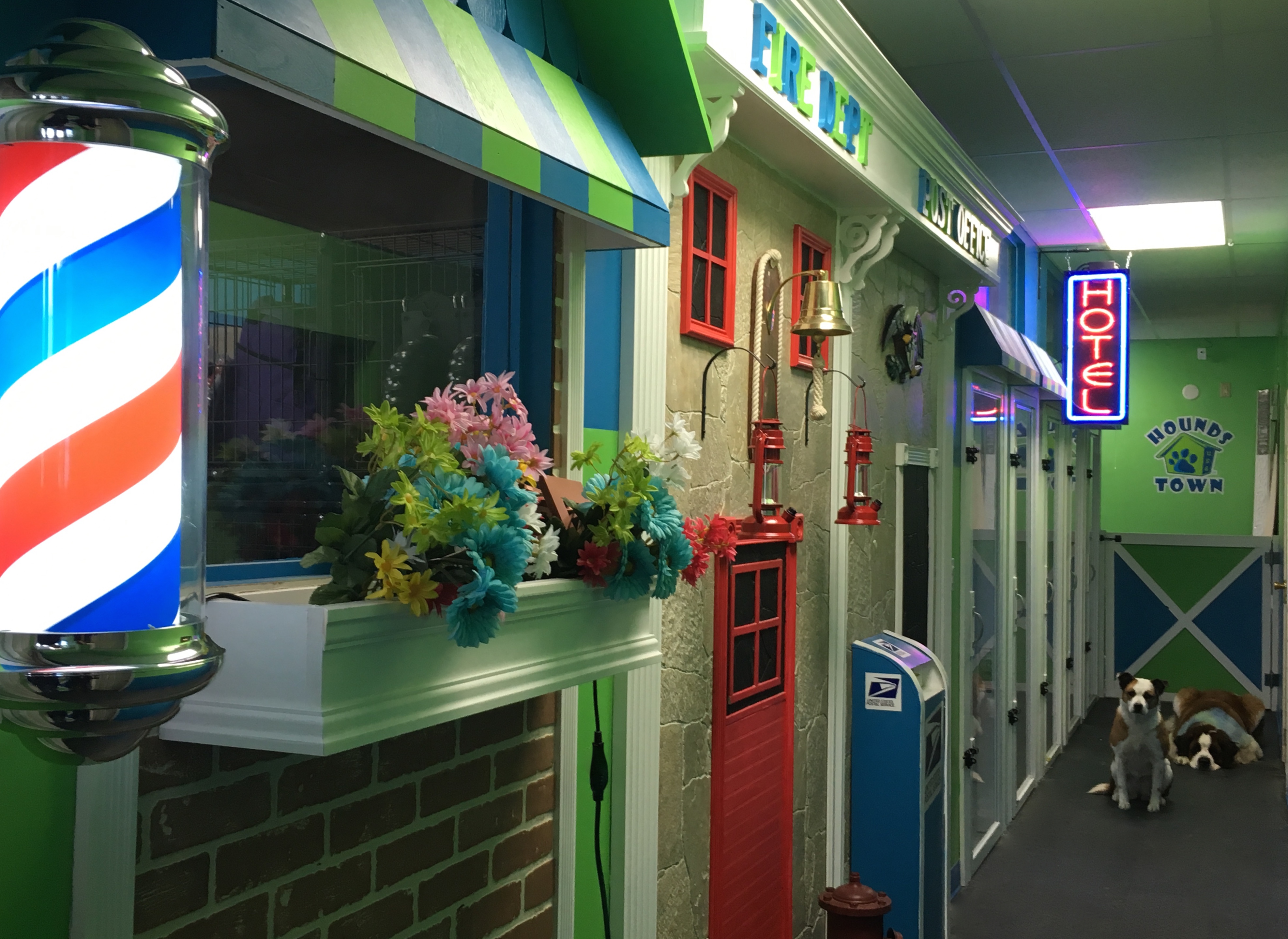 Fully interactive doggie daycare, dog grooming, and overnight dog boarding facility Hounds Town Ronkonkoma has been hard at work completing construction of Hounds Town Blvd. Complete with a barber shop (Hounds Town Day Spa), a fire department and a police station, Hounds Town Blvd. is also home to 6 brand-new 40-square-foot luxury dog suites. The suites, located in a former office area, are 40-square-feet of colorful tile and feature private windows with lots of natural light (and views of the parking lot!), oversized kuranda beds, and private play areas. The suites are ideal for larger dogs that require more space than a typical kennel, senior or disabled dogs, and any pup that enjoys a relaxing room in a quieter neck of the woods.