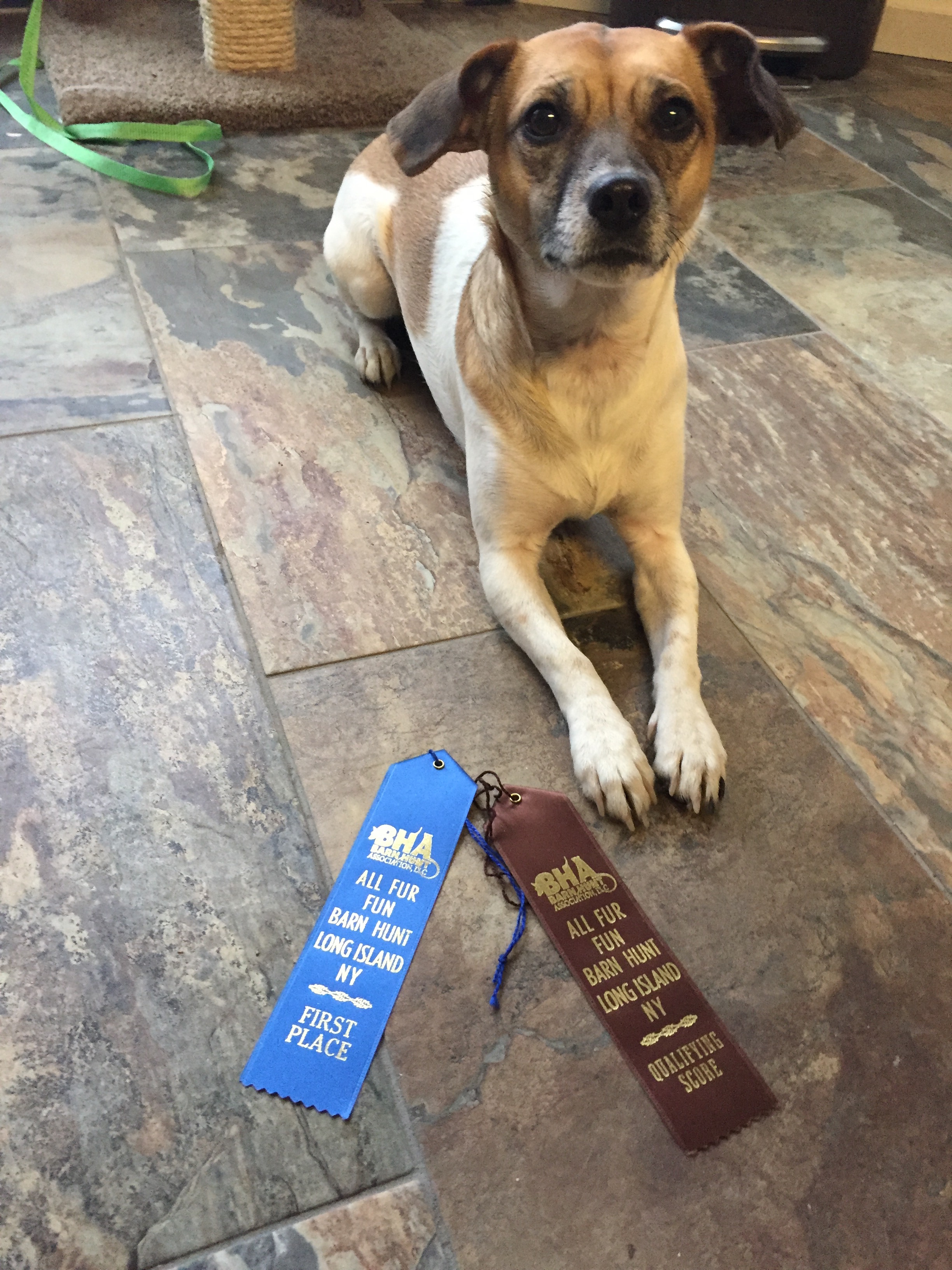 We were excited for our first Barn Hunt coming up on February 7th, 2016. When it was our time, we entered the ring, and off Jackie went, first through the tunnel, then “up” as instructed, and then immediately over to where the rat was hidden. She gave a soft snort, so I as the handler was a bit hesitant so it took me a moment to realize she must have found it. I called it at 37 seconds, and we were right! We ended up taking first place that day at the small dog novice level.