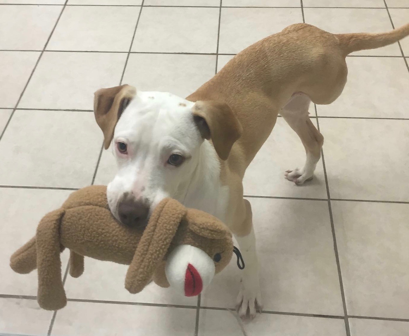 Lulu is a 7-month-old pit mix who has been through a lot in her short life. Rescued from the streets of Puerto Rico by Santuario de Animales San Francisco de Asis in Cabo Rojo, PR, Lulu was hit by a car and severely injured. Her injury required that her back leg be amputated. After some time recovering, Lulu was transported to the United States where she was adopted!