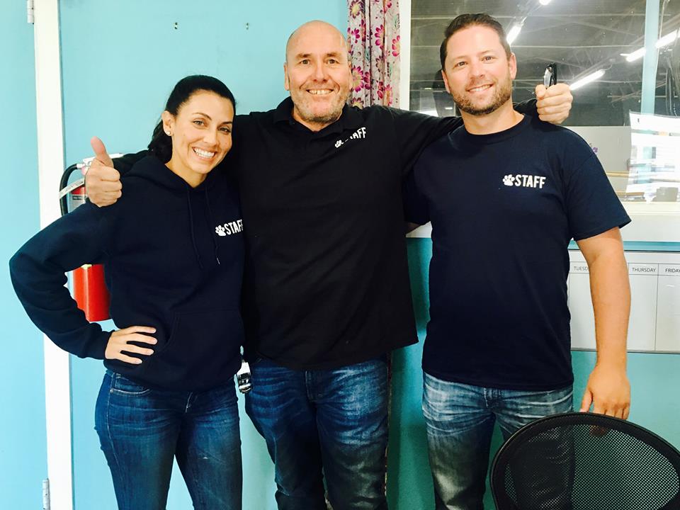 Co-owners Lauren Southard (left) and Jimmy Farrelly (right) with Hounds Town USA founder Michael Gould.