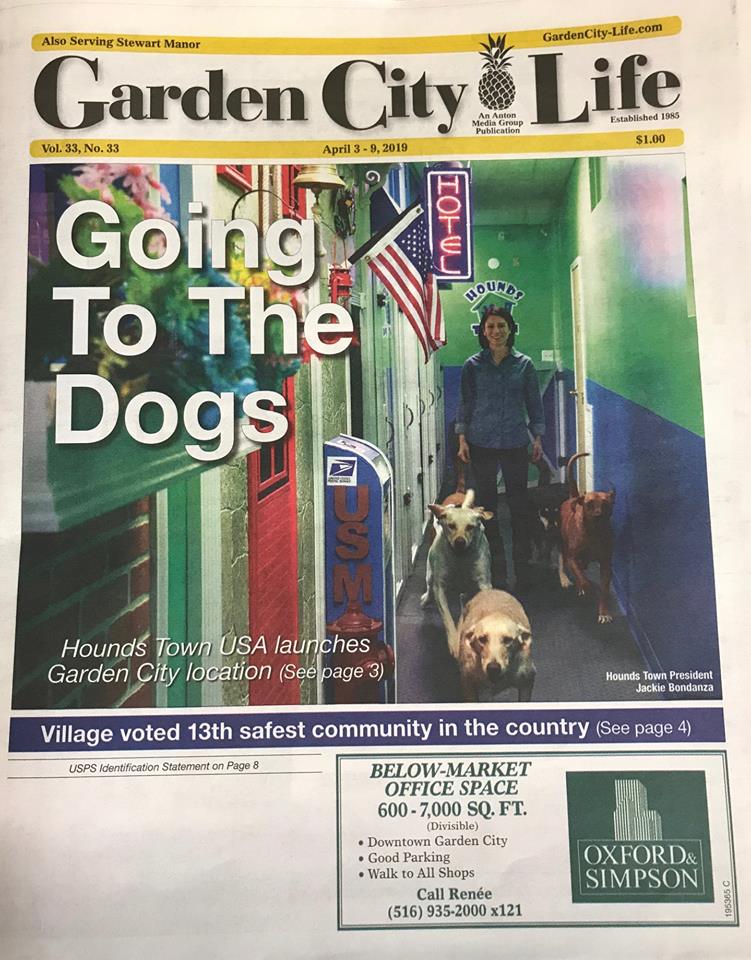 Hounds Town – Garden City is officially open and on the cover of this week’s Garden City Life! Located at 839 Stewart Avenue in Garden City, the popular doggie day care offers something different to dog owners. “I used to go to another daycare, and they were playing for only an hour, kenneled up, and that was it,” say franchisee owner Colleen Tracey-Shaver. But at Hounds Town USA, it’s different. Dogs are grouped by size, personality, and temperament, and they interact with each other all day long.